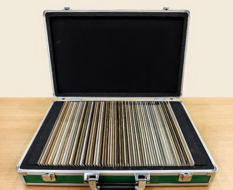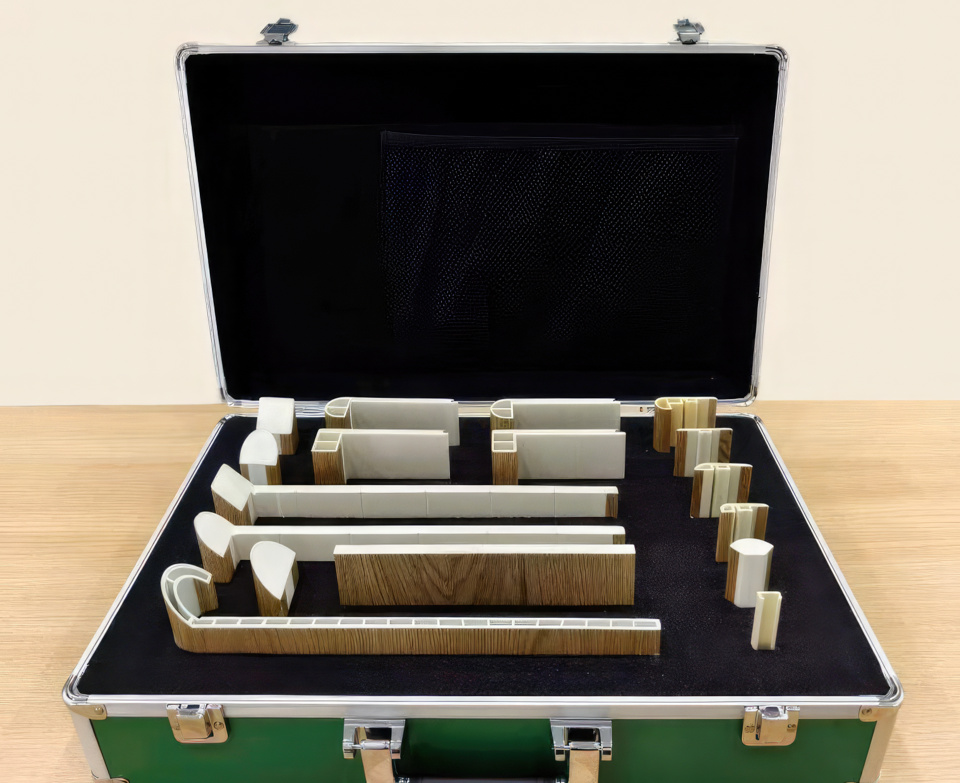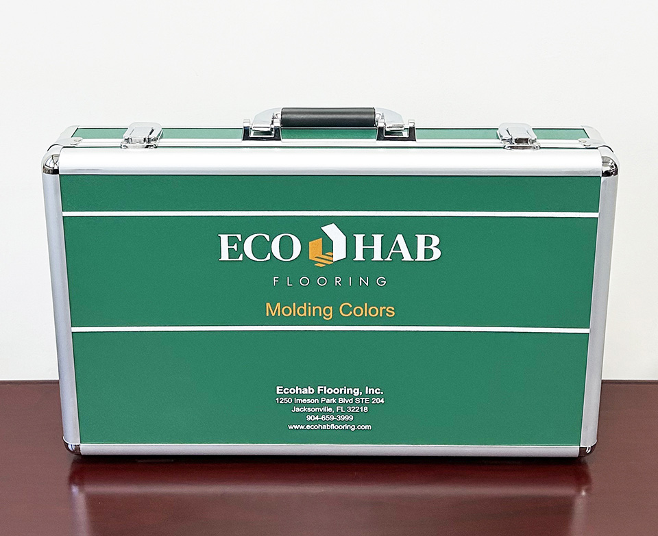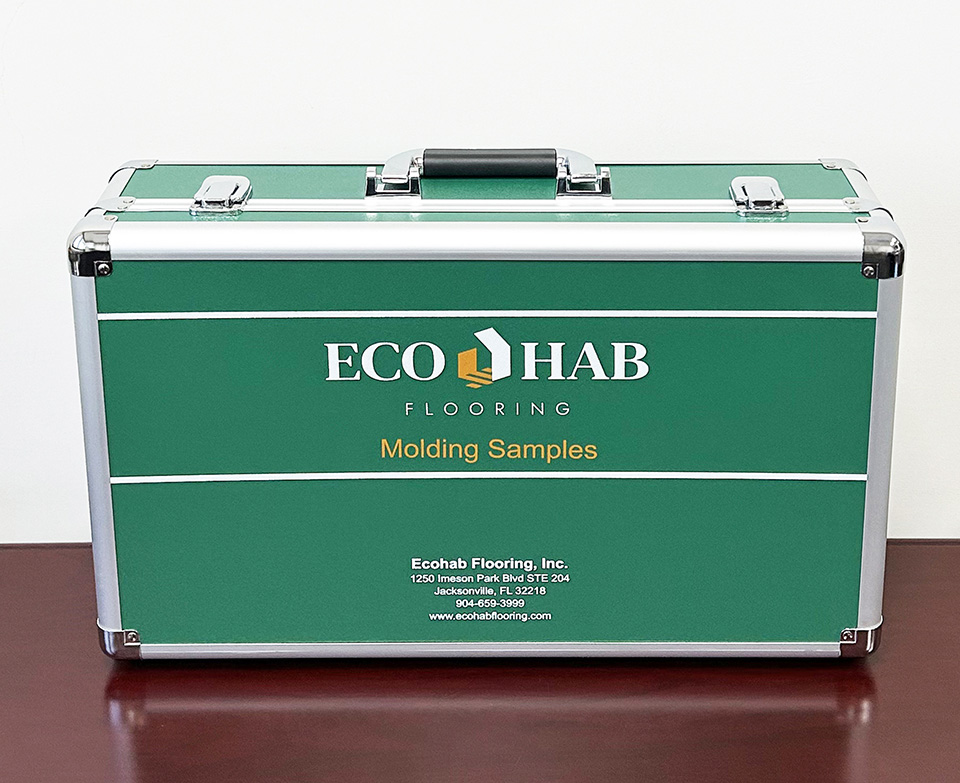A specially designed sample case showcasing 17 pieces of cut flooring trims encompassing T-molding, Reducer, End Cap, Quarter Round, PVC Track, Round/Square Stair Treads, Round/Square Stair Tread Returns, Riser, Round/Square Flush Stair Noses, and Overlap Stair Nose.|  |  |